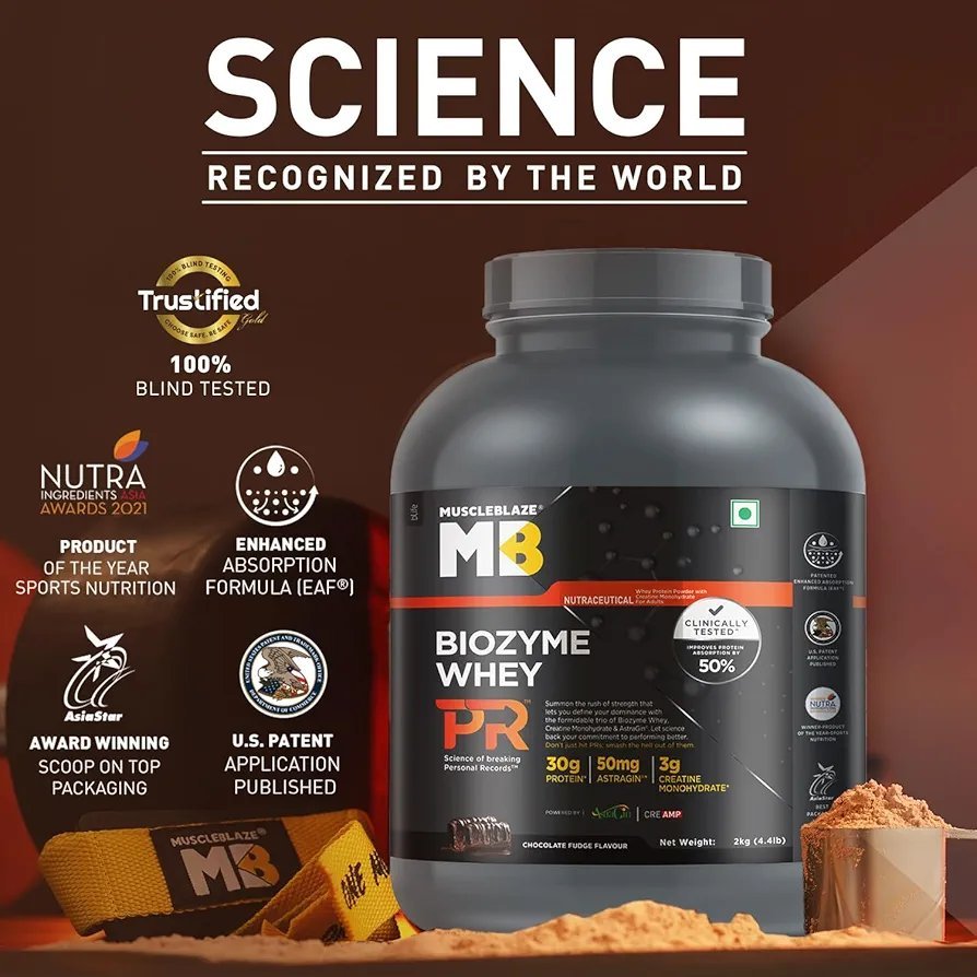 - 30g PROTEIN, 3g CREATINE MONOHYDRATE & 50mg ASTRAGIN: MuscleBlaze Biozyme Whey PR delivers all this per scoop powered by all-imported, highest grade, international quality Isolate & concentrate whey protein blend. Powerful trio lets you perform better & helps you break personal records