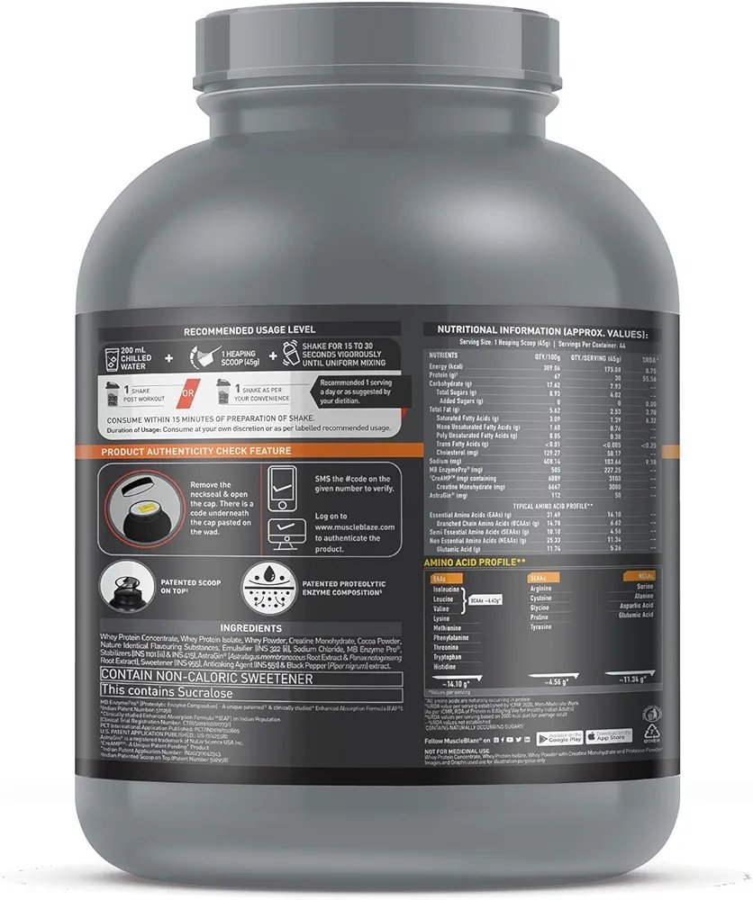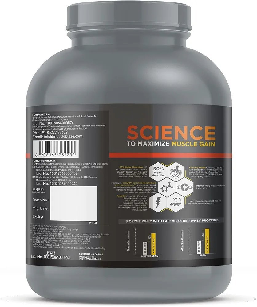 - ENHANCED ABSORPTION FORMULA (EAF): MuscleBlaze Biozyme Whey ensures 50% HIGHER PROTEIN ABSORPTION compared to other whey proteins. This proprietary formulation of MB is international patent-applied & lowers any possible protein digestion issues